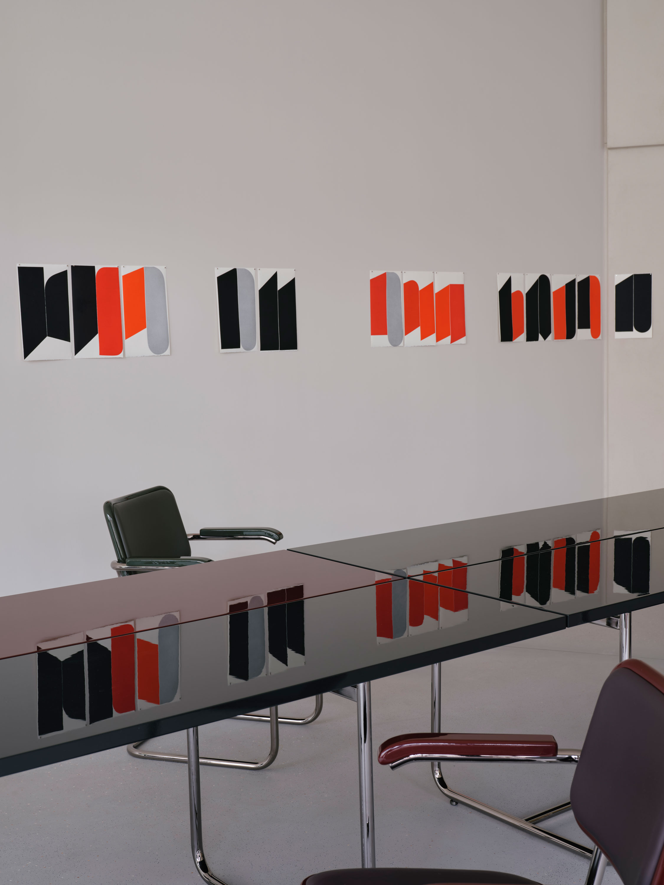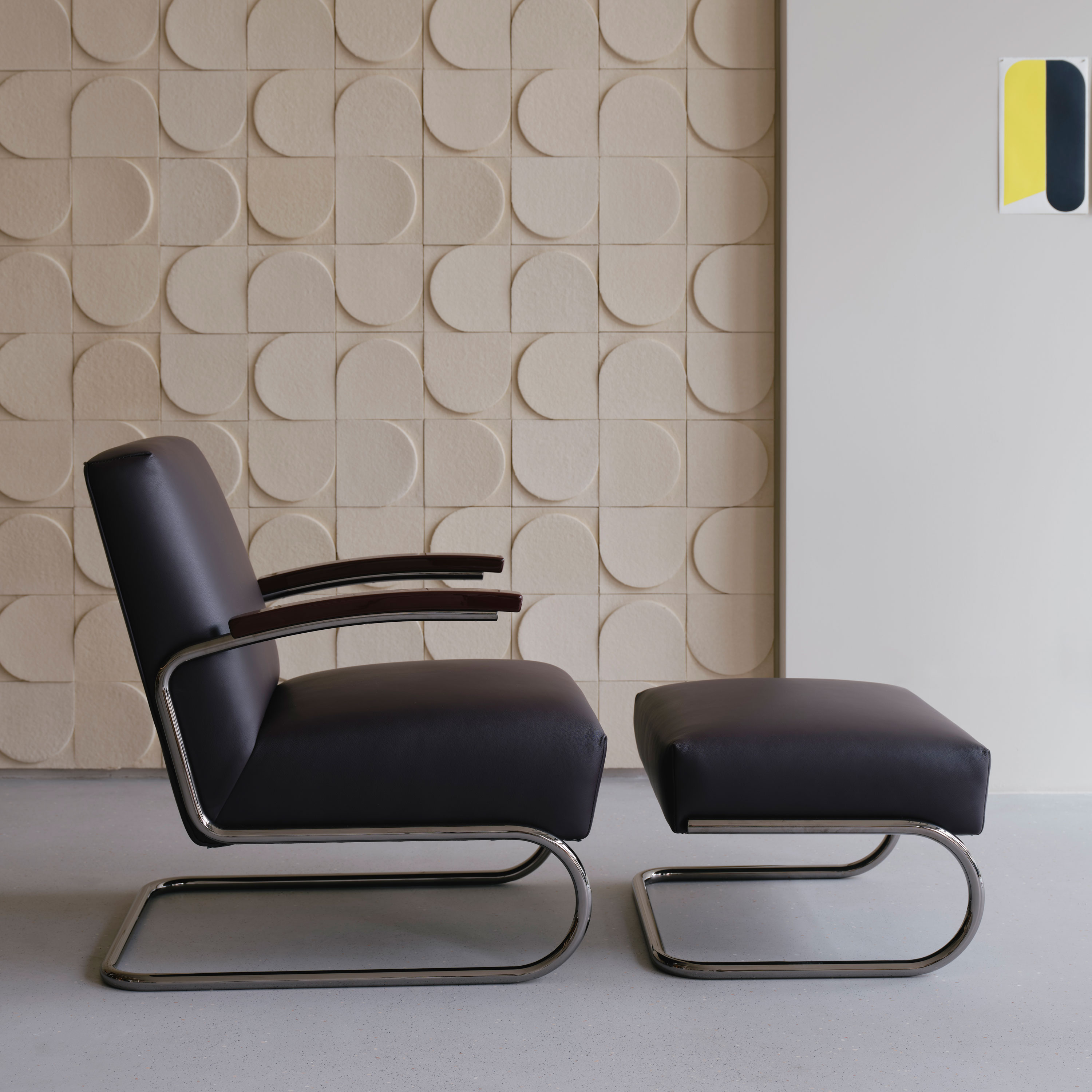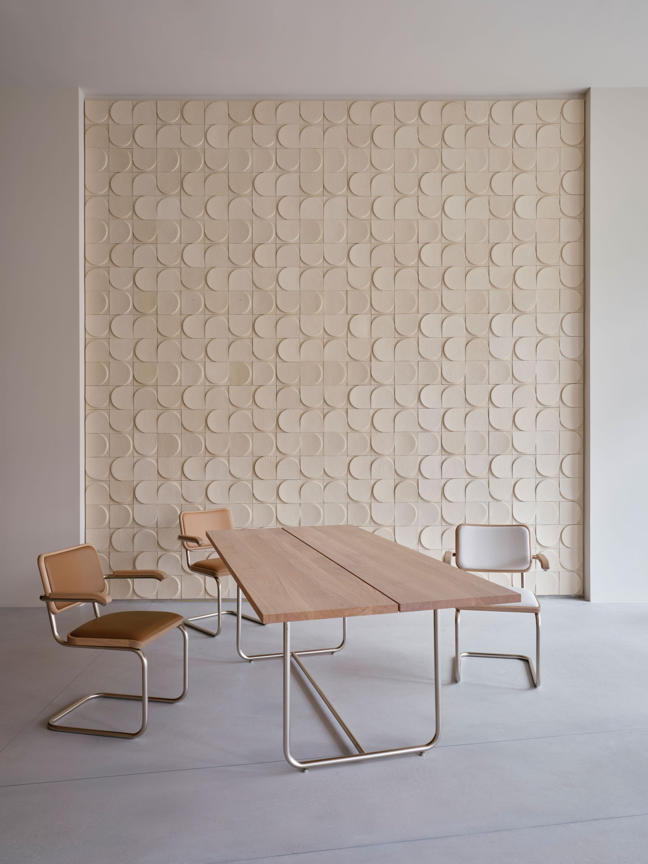 Vom ikonischen Freischwinger S 64 / 32 über den Lounge-Sessel S 411 bis zu den Tischen S 1070 und B 97 zeigt Jil Sander mit ihrer Interpretation der Thonet Stahlrohr-Klassiker eindrucksvoll, wie nuancierte Farbkonzepte und luxuriöse Materialien puristische Entwürfe weiterführen und veredeln.